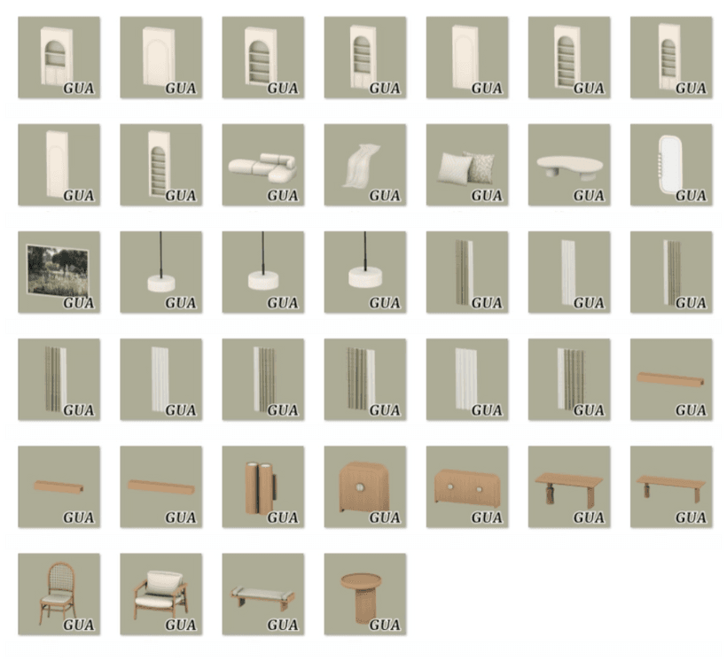 Коллекция мебели для гостиной и столовой, включающая разнообразные предметы интерьера. Более 30-ти элементов, включая мебель, освещение, декор и занавески.